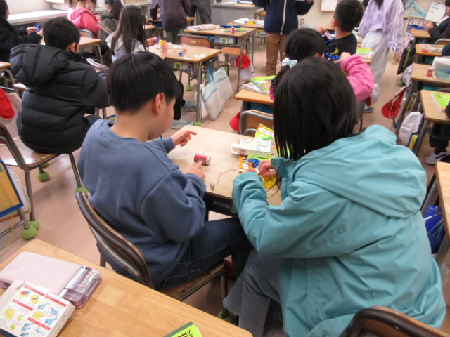 豆電球に明かりをつけて電気の回路を調べている3年生。