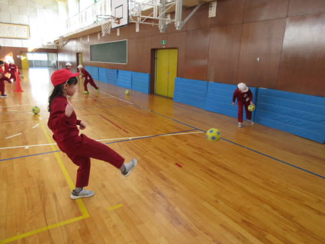 まずは手始めに壁に立てかけたマットをゴールにして,各自思い切り蹴るところから始めます。