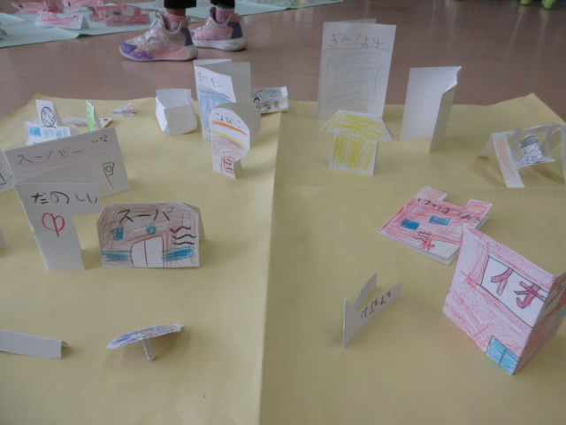 1年生は図工「おって たてたら」で作った作品を友達と一緒に並べてみたら,町や野原,海などができあがりました。