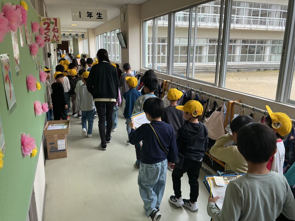 2年生が、1年生と一緒に学校を探検しました。1年生教室でペアになりました。2年生が生活科で作ったけん玉をプレゼントしました。