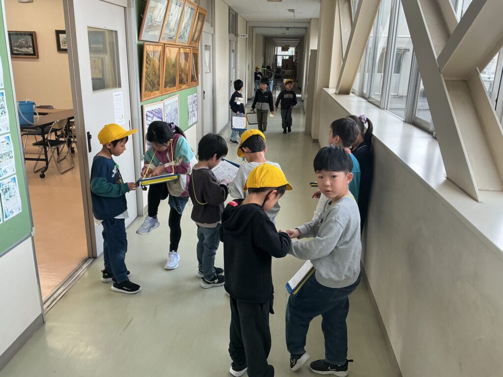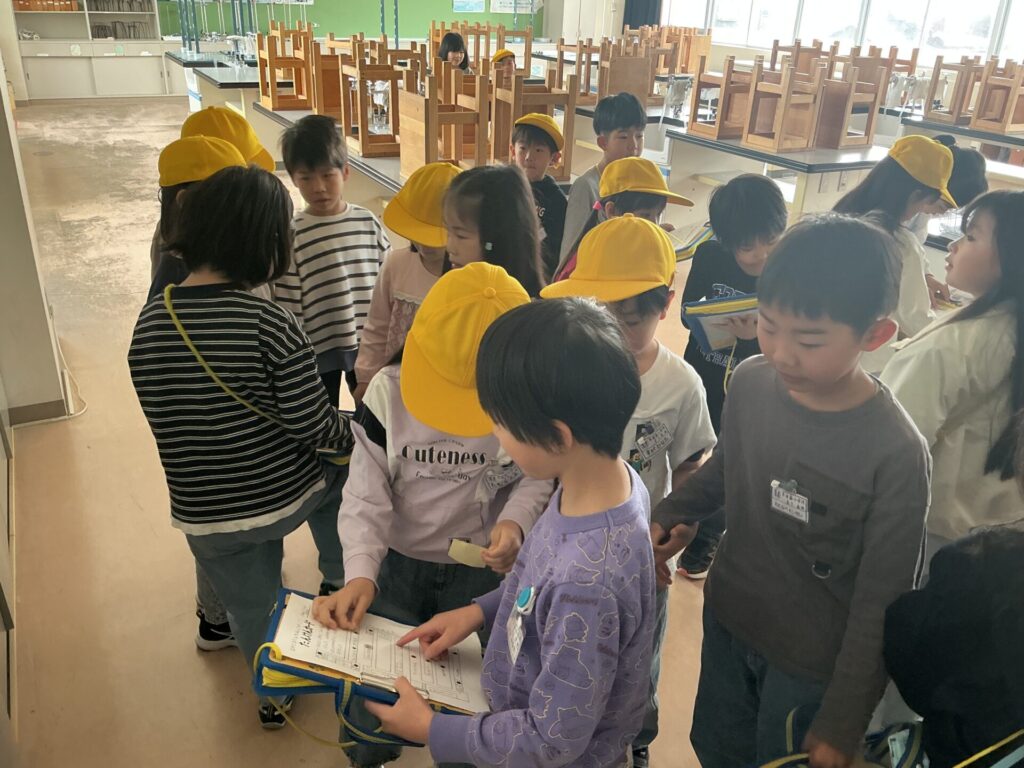 いよいよ出発。優しいお兄さんお姉さんと手を繋ぎ、静かに廊下を歩いて探検です。教室の前で2年生が「ここは、理科室だよ。」と説明してくれました。探検が終わった教室には、シールを貼りました。