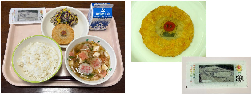 さらに、給食委員会の子どもたちがデザインした「太陽マンコロッケ」と「50周年記念デザイン味付けのり」を見た子どもたちのテンションは最高潮です!記念に給食の写真を撮る子どもがたくさん!