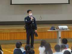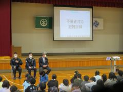 17日(月)に、今年度4回目の避難訓練を実施しました。不審者の侵入を想定して行いました。不審者が侵入した場合は、不審者から遠ざかり、鍵のかかる場所に避難します。新潟中央警察署の方々の協力を得て、実際に不審者が侵入してから、確保するまでの動きを確認しました。体育館での振り返りでは、訓練の様子を写真で見ました。警察署の方からは、自分の身は自分で守る、いかのおすしを守る、大きな声を出して助けを求めるなどの大切なお話がありました。校長先生からは、日頃からしっかりとあいさつをすることと、集中力をもって生活し、考える力を高めることで、不審者から身を守ることができるというお話がありました。全校のみんなが、静かに落ち着いて行動できた避難訓練でした。