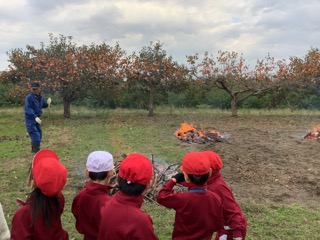1.2年生が畑で育てたお芋を焼き芋にします。毎年、地域のボランティアの方たちが協力してくださいます。 地域の方からいただいた木材で火を起こし、ボランティアで来ていただいたお家の方から良い大きさに切っ …