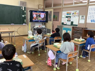 今日はいつもおいしい給食を作ってくださっている調理員さんと白倉栄養教諭が来て一緒に給食を食べました。他の学年は、給食を作る様子を動画で見せてもらいました。 大きなお鍋にびっ …