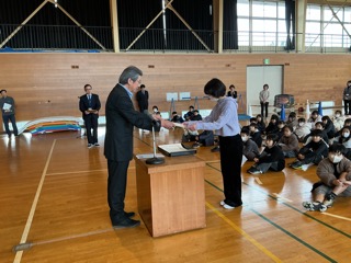 今日は、あいさつ標語、交通安全標語、あいさつキャラクターの受賞作品表彰と、卒業式の歌練習をしました。 関根様、藤崎様にご来校いただき、表彰していただきました。標語は、パネルにし …