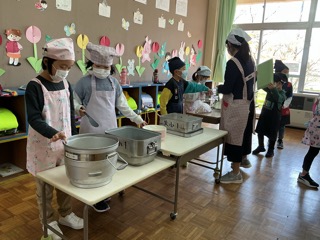今日から1年生も給食が始まりました。まずは、みんなで準備です。エプロンの後ろのボタンが止められず、困っている友達がいたら、そっと手伝うやさしい姿も見られました。牛乳を運んだり、盛り付けをしたりみんな …