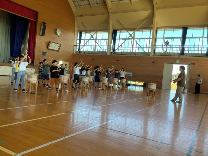 4年生が文化祭で演奏する樽太鼓の練習をしています。今日は東先生に来ていただきました。