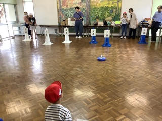 2年生が親子行事でカーリング的当てを楽しんでいます。意外な動きをするフロッカーストーンを巧みに操り高得点をねらいます。