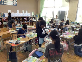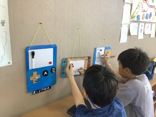 5年生は伝言板の仕上げ中。早くニスが乾きますように。