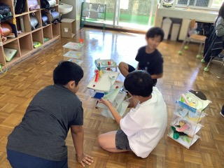 ビー玉の通り道を工夫して、楽しみながら製作している4年生。