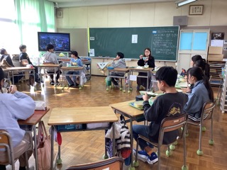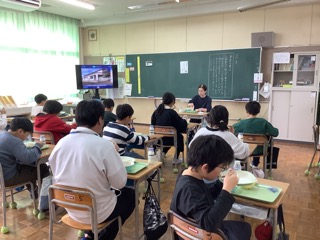 今日はいつもおいしい給食を作ってくださっている調理員さんと白倉栄養教諭が来て一緒に給食を食べました。他の学年は、給食を作る様子を動画で見せてもらいました。