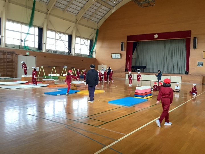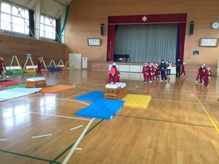 1,2年生は一緒に跳び箱遊びの学習です。手で身体を支えて身体を前に送る練習です。2年生にお手本を見せてもらって、