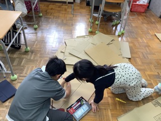 穴を開ける時は協力して作ります。完成が楽しみですね。