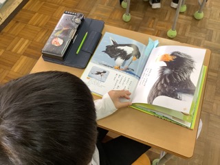 2年生が国語の学習で、本を読んで自分が気になったところに付箋を貼り、互いに見合っていました。