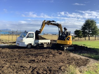 雪が降る前に、芝刈り後の芝の山を畑に広げています。