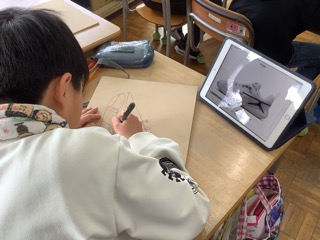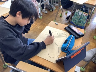 6年生が版画の学習を始めました。自分で選んだ題材で、白くするところ、黒くするところを考えながら彫り進めます。