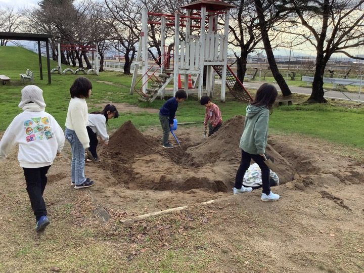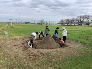 トンネルを掘ったり、壁をつくったり、みんなで力を合わせて製作中。この先が楽しみです。
