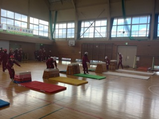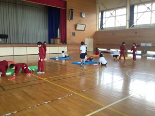 今日は4年生がマット運動、5.6年生が跳び箱の学習に取り組んでいました。