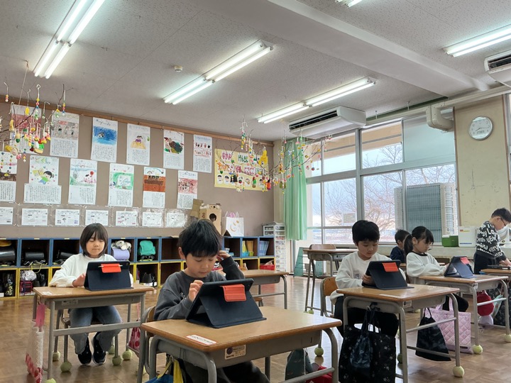 1年生教室では、小正月のお飾りに守られて、1年生が朝読書の準備中です。