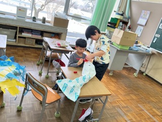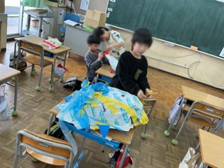 2年生が図工で造形遊びを楽しんでいました。大きな紙で作った袋に紙を詰めて、ふわふわさせ、思い思いの作品を作っています。