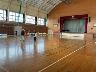 体育館では、学年を越えてバレーボール