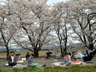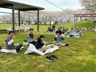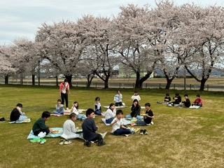 今日は、令和8年度最初に給食でした。天気もよかったので、みんなでグラウンドに出て給食を食べました。