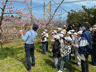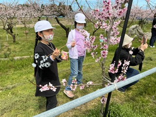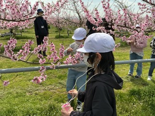今日、3年生は総合的な学習の時間の活動で、桃の受粉作業体験をしました。場所は、青山農園さんです。