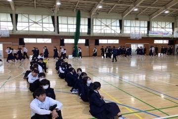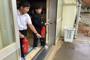 テストが終わった4時間目、火災を想定した「避難訓練」がおこなわれました。どの学年も、緊急放送の指示をよく聞き、落ち着いて行動する姿が見られました。最後に、代表生徒が水消火器を使い、消火訓練をおこないました。