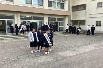 本日より、新年度の生徒会役員選挙活動が始まりました。立候補した生徒は、朝のあいさつ運動やポスター掲示などを通して、自分の考えを一生懸命に伝えています。
