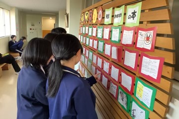 また、図書館前には「先生のおすすめ本」の紹介コーナーが展開されています。昼休みになると生徒の皆さんが足を止めてじっくり見ている姿が増え、読書への関心が広がっていることを感じます。
