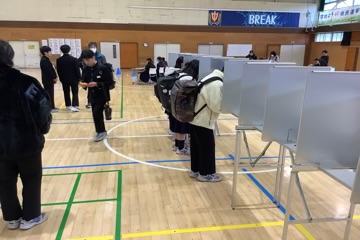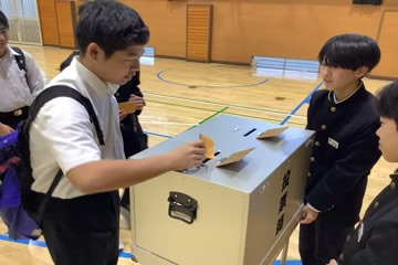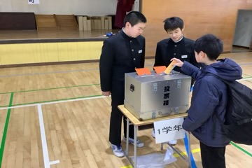 生徒会役員選挙では、実際の選挙で使われている投票箱や記載台を使用しました。本物の道具を用いることで、生徒に選挙の仕組みや社会における投票の大切さを学ぶ良い機会となりました。