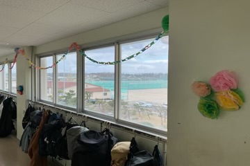 また、校内を彩っているのは装飾だけではありません。本日、用務員さんが「最高の門出を、一番きれいな景色で迎えてほしい」と、校舎の窓を一枚一枚ピカピカに磨き上げてくれました。