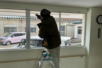また、校内を彩っているのは装飾だけではありません。本日、用務員さんが「最高の門出を、一番きれいな景色で迎えてほしい」と、校舎の窓を一枚一枚ピカピカに磨き上げてくれました。