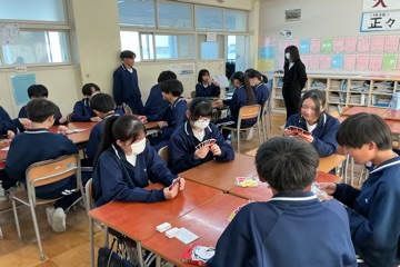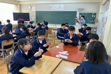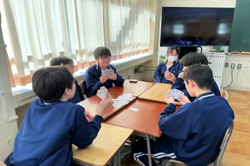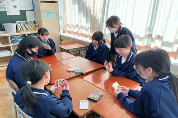 学年委員が司会をして、トランプやUNO、ジェスチャーゲームに百人一首など、学級対抗で競っていました。どの会場も笑顔が溢れていました。