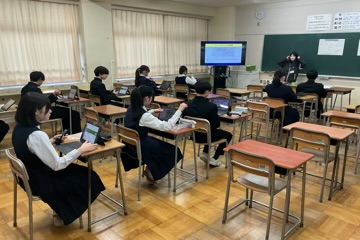 教室には英語科の教員に加え、ICT支援員さんも入り一人ひとりの端末操作をきめ細かくサポートしました。ヘッドセットを通した録音や入力など、普段の授業とは異なる作業も多くありましたが、生徒たちは説明を真剣に聞き、一つひとつの工程を丁寧に進めていました。
