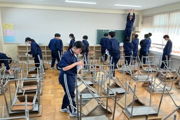 本日4限、2年生は「年度末大清掃」を実施しました。生徒たちは「ウルトラ整備隊」と称し、1年間お世話になった校舎を隅々まで磨き上げていました。