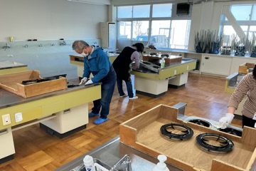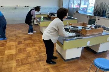 生徒たちが大清掃に励んだ本日、放課後の調理室に地域のボランティアの皆様が、清掃に駆けつけてくださいました。家庭科の授業で使用したガスレンジや換気扇の頑固な油汚れを、たわしやスポンジを手に一つひとつ丁寧に磨き上げてくださいました。