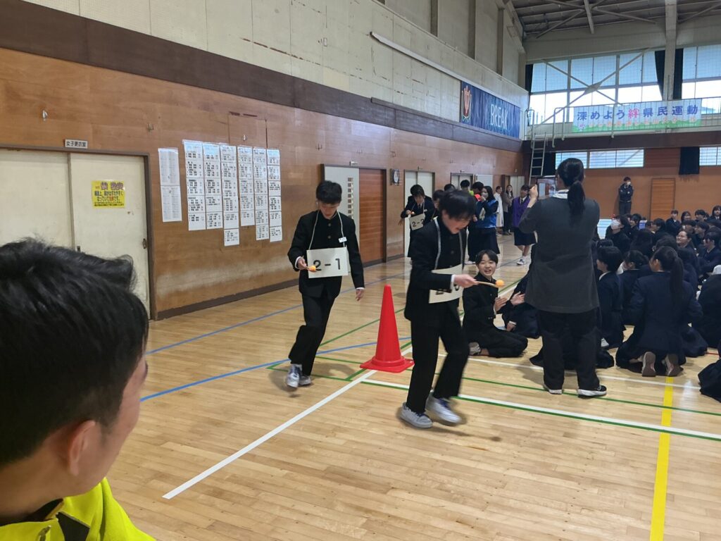2年生は、ピンポン玉運びリレーでくじ引きの順番を決めました。