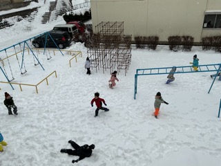 雪が積もったので、15分休みや昼休みには、グラウンドや中庭に出て、雪だるまをつくたり、雪合戦をしたりして楽しんでいます。雪が降っていても、へっちゃらで寒さも吹き飛ばして夢中になって遊んでいます。