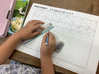 「三角形と四角形」の学習のまとめとして、三角形と四角形を使った「しきつめもよう」作りに挑戦しました。点と点を結んでいろいろな三角形と四角形を作っていきます。できた図形に色を塗って完成です。子どもらし …