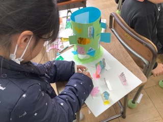 初めてカッターを使って取り組んだ図工の「まどをあけたら」の作品が完成をむかえています。カッターを上手に使って窓のある建物を作りました。窓からは、動物やキャラクターなどが顔をのぞかせています。建物の中 …