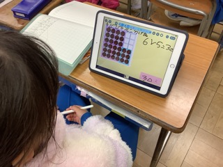 箱の中に残っているチョコレートの数を九九を使って求める問題に挑戦しました。「6個のグループが5つできるから、6×5=30 30個」「右端の3個を上に移動して、6×5=30 30個」「全部入っていたら6×6=36、6個ないか …