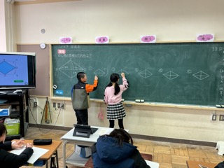 平行四辺形や三角形、台形などの面積の求め方を学習しています。マス目を数えたり、長方形に変形したりして、いろいろな図形の面積の求め方を考えます。求めた方法を整理して、公式へと導いていきます。今日は、ひ …