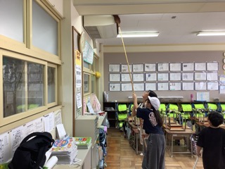 前期も終わりが近づいてきたので、教室や廊下の大清掃を行っています。すす払いでエアコンについたほこりを落としたり、新聞紙を使って窓ガラスを拭いたりして、隅々まで清掃しています。なかよし班で力をあわせて …
