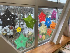 わかくさルームを利用している子どもたちが、折り紙を使った切り絵に取り組んでいました。広げると五角形になるように折り紙を折り、切り抜きたい形を書いて、ハサミで切り抜きます。開いてみると、キレイな雪の結晶のような形ができます。できた紙を窓に貼って飾りました。日が当たると、キレイな影絵ができて、とても素敵です。