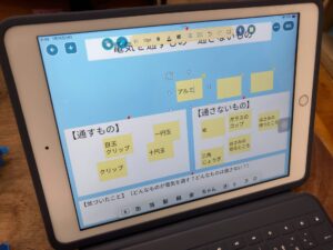 乾電池と豆電球を使って、どうつなげば、豆電球がつくのか、どんな物が電気を通すか、などを学習しています。今日は、電気を通す物調べに挑戦していました。プラスチック、アルミホイル、紙、木など、どれが電気を通すのかを調べました。子どもたちは「金属が電気を通す」と予想を立てていましたが、椅子のパイプが電気を通さず、「あれ?」っとなっていました。どうして椅子のパイプは電気を通さなかったのか、これからの学習で解決していきます。