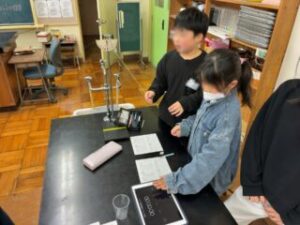 ふりのこが1往復する時間には、何が関係しているのかを調べる実験に取り組んでいます。「おもりの重さ」「振れる角度(幅)」「ふりこの長さ」の三つについて調べ、ふりこのきまりを探っていきます。今日は、「振れる角度(幅)」が15°と30°の違いについて調べていました。