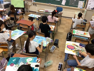 来月予定されている絵画展示に向けて、全校児童が熱心に作品作りに取り組んでいます。自分の思いが表現できるように色の塗り方を工夫したり、構図を考えたりしながら制作しています。出来上がりをお楽しみに!!