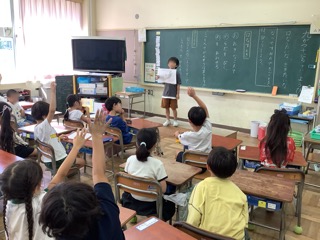 国語で、夏休みの出来事を発表しました。めあては、「大きな声で」「顔をしっかりあげて」「目を見て」「質問や感想もできるように」です。